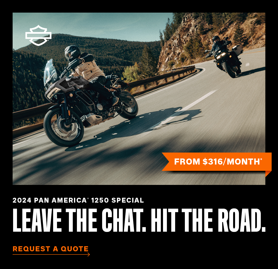 *Financing Offer available only on new Harley-Davidson® motorcycles financed through Eaglemark Savings Bank (ESB) and is subject to credit approval. Not all applicants will qualify. This 11.74% offer is available on new Harley Davidson® motorcycles to high credit tier customers at ESB and only for up to an 84-month term. The APR may vary based on the applicant’s past credit performance and the term of the loan. For example, a 2024 Pan America® 1250 Special motorcycle in Billiard Gray with an MSRP of $19,999, 10% down payment and amount financed of $17,999.10, 84-month repayment term, and 11.74% APR results in monthly payments of $315.24. In this example, customer is responsible for applicable taxes, title, licensing fees and any other fees or charges at the time of sale. APR is calculated according to the simple interest method. Not valid in conjunction with other offers. Other terms, conditions, and limitations may apply. Dealer participation may vary. Financing offer is subject to change or cancellation at any time. See your Harley-Davidson® Dealership for details.